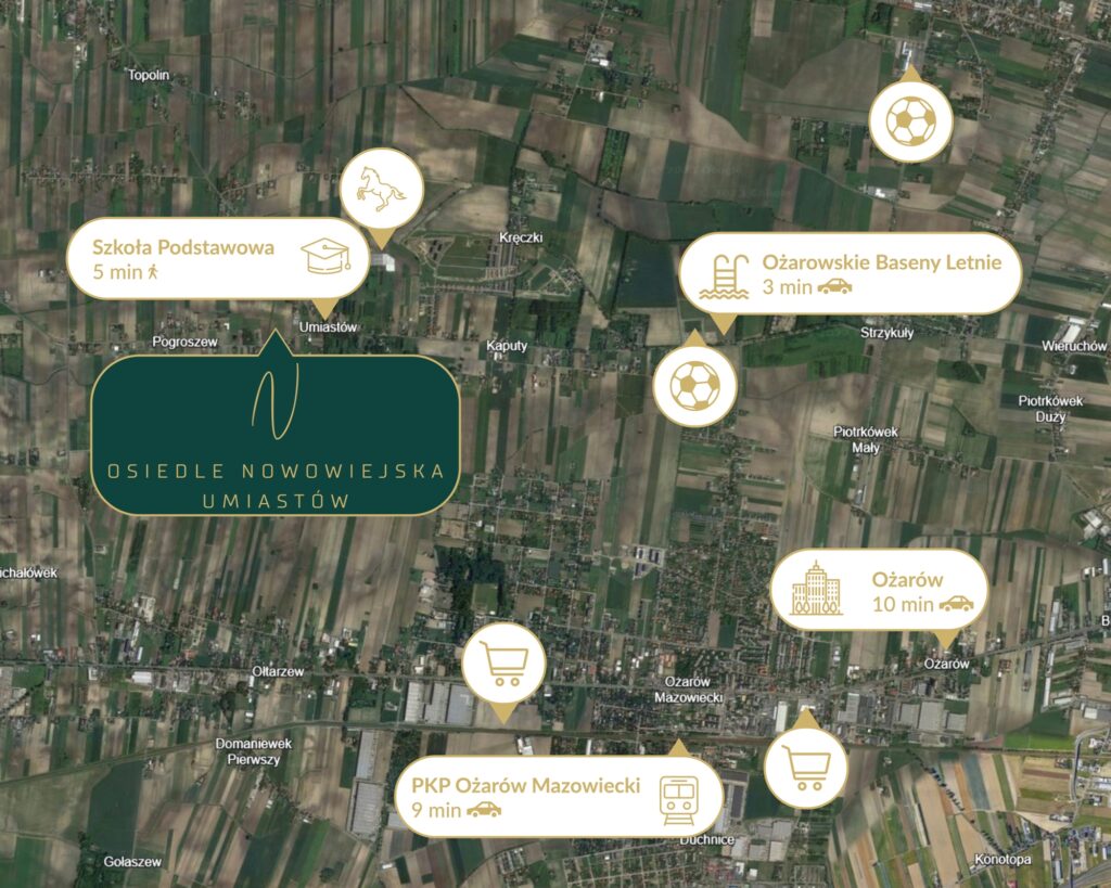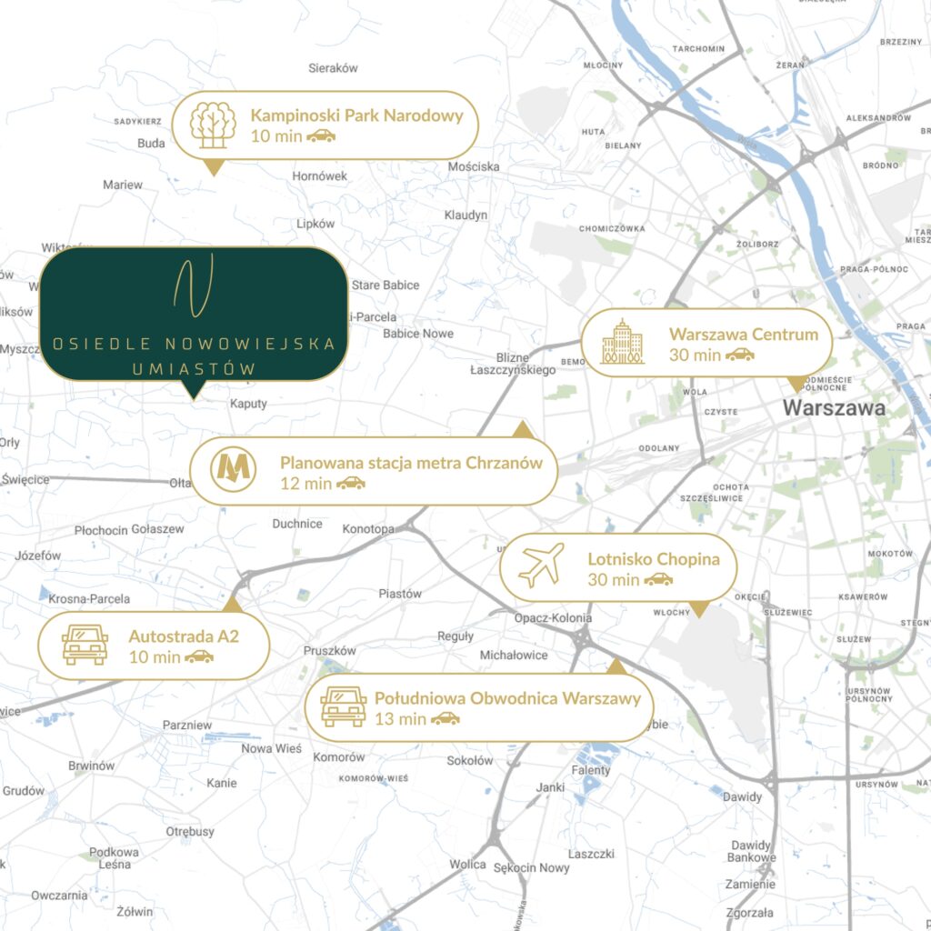 Nowoczesne osiedle, powstające w otoczeniu natury, usytuowane jest w odległości 10 minut od zachodniej granicy Warszawy.