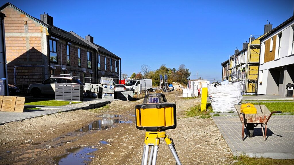 Rozpoczynamy budowę wewnętrznej drogi dojazdowej! Na budowę ściągnął dziś ciężki sprzęt – ciężarówki, koparki, HDSy. Ekipy przywiozły kostkę, obrzeża, rury, kruszywo, beton. Pojawił się geodeta i niwelator. W pierwszym kroku przedłużać będziemy zjazdy z posesji w Etapie 1, w kolejnym utwardzać podbudowę pod kostkę, a finalnie położymy kostkę – wszyscy mieszkańcy osiedla zyskają schludny, bezpieczny i równy dojazd do swoich posesji.